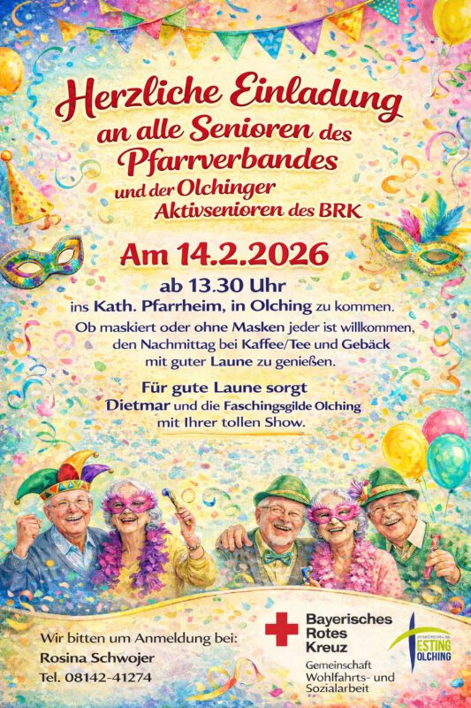Seniorenfasching der BRK-Aktivsenioren und Senioren des Pfarrverbandes Termin Details Datum: 14. Februar 2026 13:30 – 17:00 Ort: Pfarrsaal Olching Terminkategorien: Veranstaltung